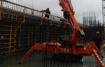 Монтаж металлоконструкций при строительстве пешеходного перехода через третье транспортное кольцо в Москве с помощью мини-крана SPX 527.