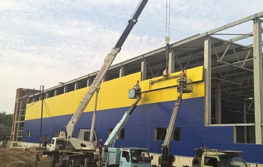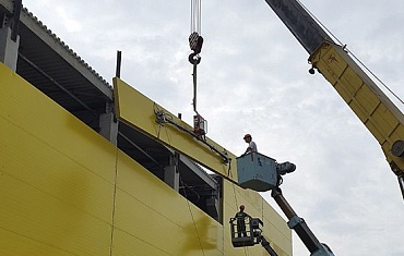 Монтаж ограждающих конструкций в виде сэндвич-панелей осуществлен с применением вакуумного захвата ARLIFTER SP-3.